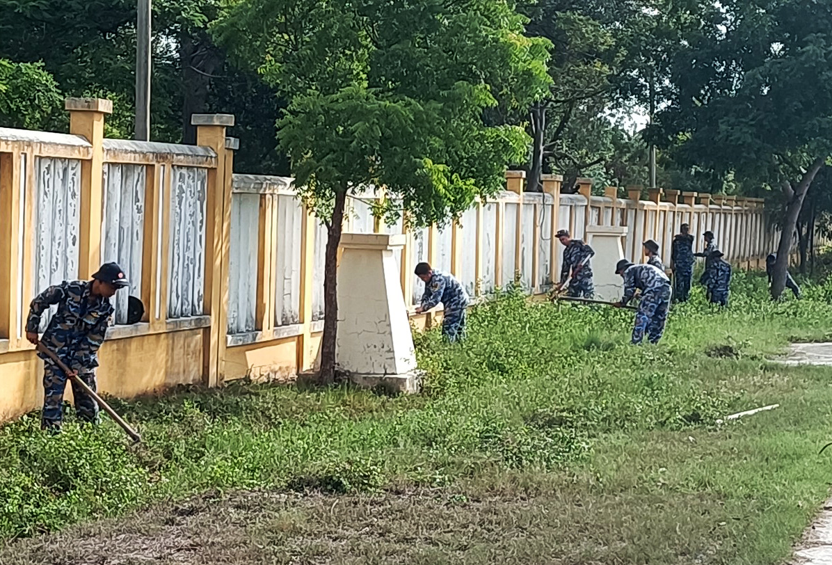 Đoàn viên, thanh niên phát quang bụi rậm phía ngoài tường bao doanh trại đơn vị