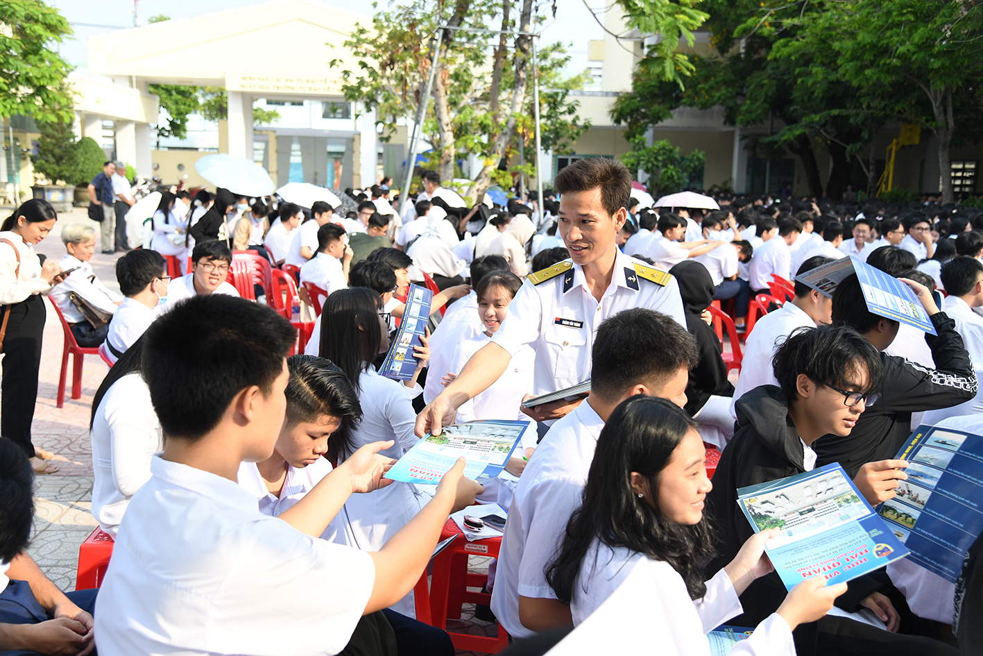 Báo cáo viên của Vùng 5 phát tài liệu tuyên truyền về Học viện Hải quân