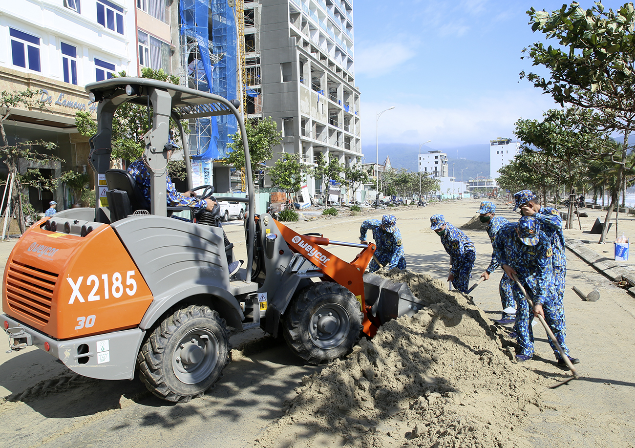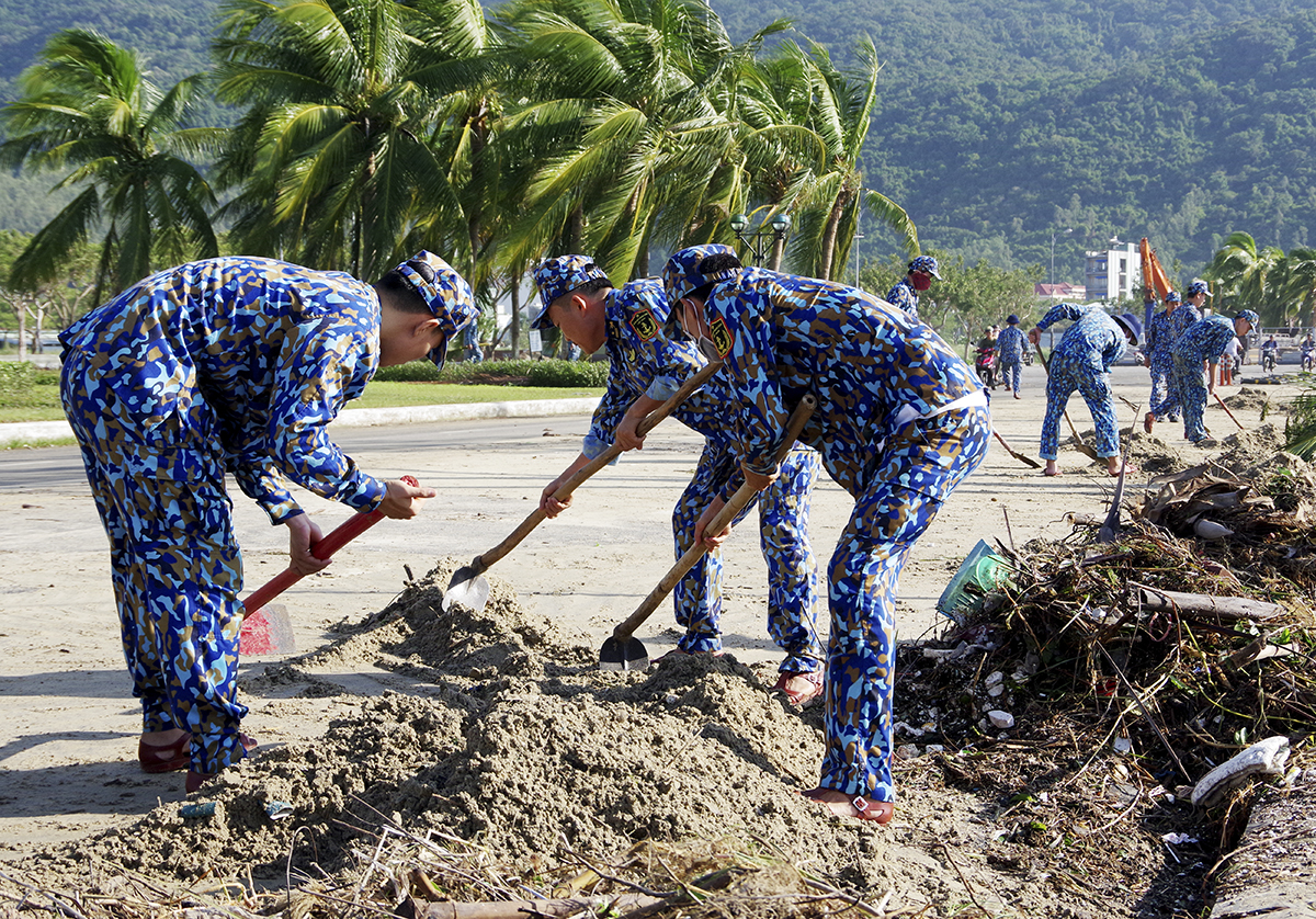 * Tiểu đoàn 353 và cơ quan Trung đoàn 351, Vùng 3 cử gần 40 cán bộ, chiến sĩ tham gia thu gom cát, rác thải tại khu vực đường Hoàng Sa; phối hợp với địa phương vận chuyển cây đổ gẫy, thu gom và phân loại rác, vận chuyển cát làm sạch các trục đường.