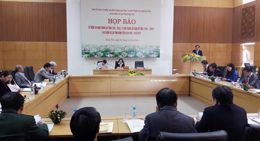Sáng 1-12, tại TP. Hưng Yên, Ban tổ chức kỷ niệm 185 năm thành lập tỉnh (1831-2016), 75 năm thành lập Đảng bộ (1941-2016), 20 năm tái lập tỉnh Hưng Yên (1-1-1997-1-1-2017) đã tổ chức buổi Họp báo giới thiệu về chương trình kỷ niệm.