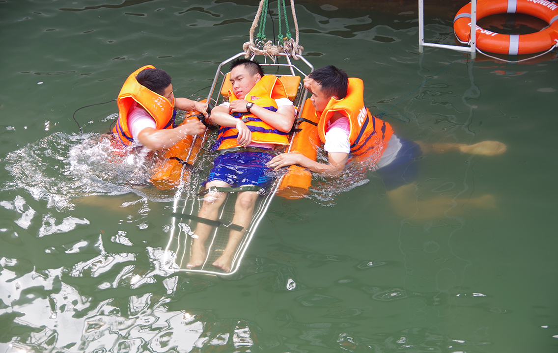 Ở mạn phải, có tiếng hô to: “Mạn phải có người rơi xuống nước”. Từ đài chỉ huy, Đại úy Bùi Việt Hoàng, Thuyền trưởng Tàu 360 nhanh chóng phát lệnh báo động: “Báo động chiến đấu cấp 1, toàn tàu báo động cứu người rơi xuống nước”, “Máy phải dừng, hết lái phải”... Ngay lập tức, thuyền trưởng điều động tàu tiếp cận vị trí người rơi xuống nước, thuyền phó xác định và đánh dấu vị trí người rơi xuống nước lên hải đồ, chiến sĩ tín hiệu treo cờ báo hiệu “Tàu đang có người rơi xuống nước”. Tình huống đặt ra là khi tàu tiếp cận gần, nạn nhân đã bất tỉnh. Hai đồng chí nhanh chóng xuống nước, sử dụng cáng cứu thương tiếp cận, cứu vớt người bị nạn. Sau khi được cố định vào cáng, các đồng chí trên tàu nhanh chóng đưa người rơi xuống nước lên tàu.