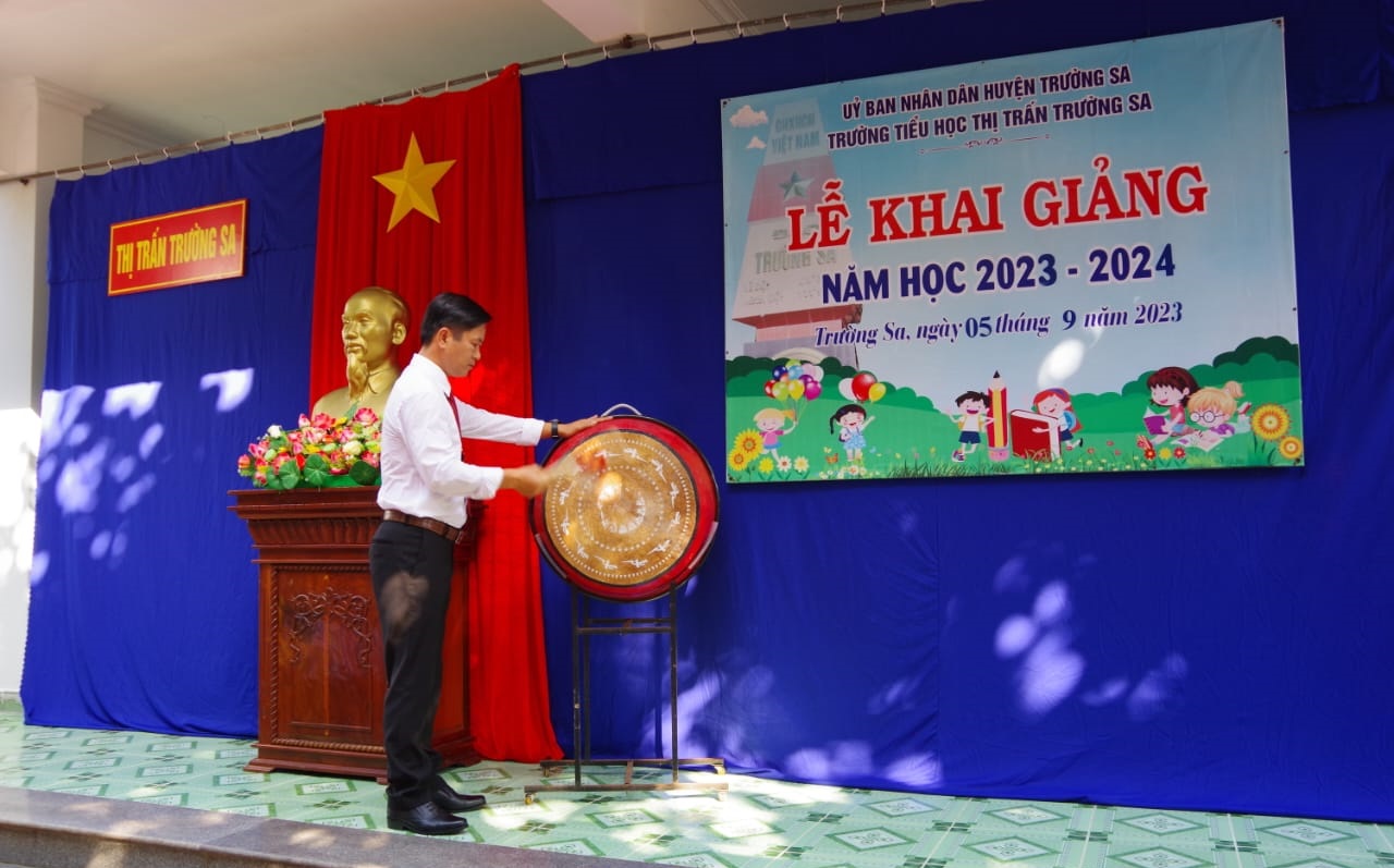 Ông Trần Quang Phú, Chủ tịch UBND thị trấn Trường Sa đánh trống khai giảng năm học mới
