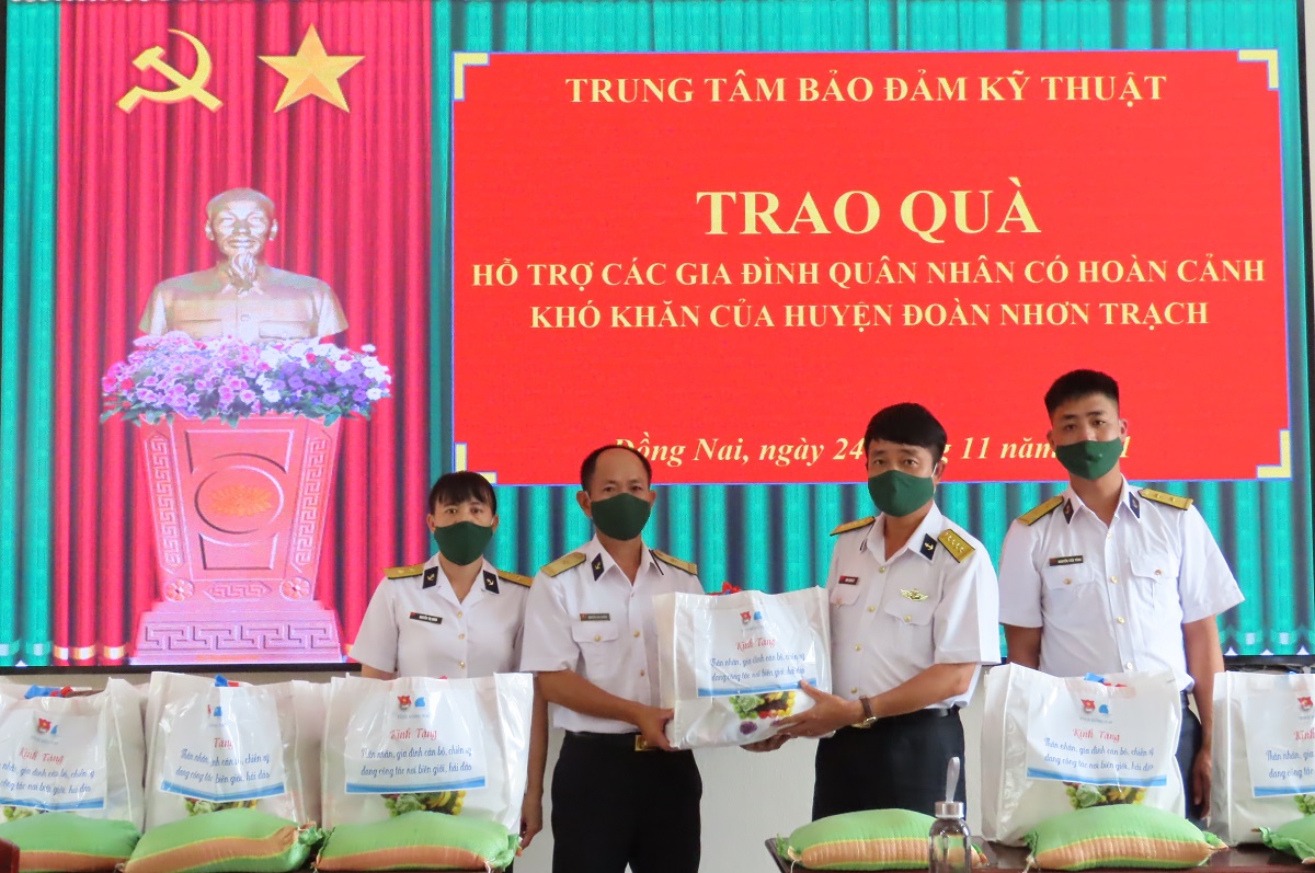 Chiều 24/11, tại huyện Nhơn Trạch, tỉnh Đồng Nai, Trung tâm Bảo đảm kỹ thuật Vùng 2 Hải quân tổ chức trao quà hỗ trợ của Huyện đoàn Nhơn Trạch tới các gia đình quân nhân đơn vị có hoàn cảnh khó khăn. Đại tá Đinh Quang Uy, Chỉ huy trưởng Trung tâm dự và chủ trì.