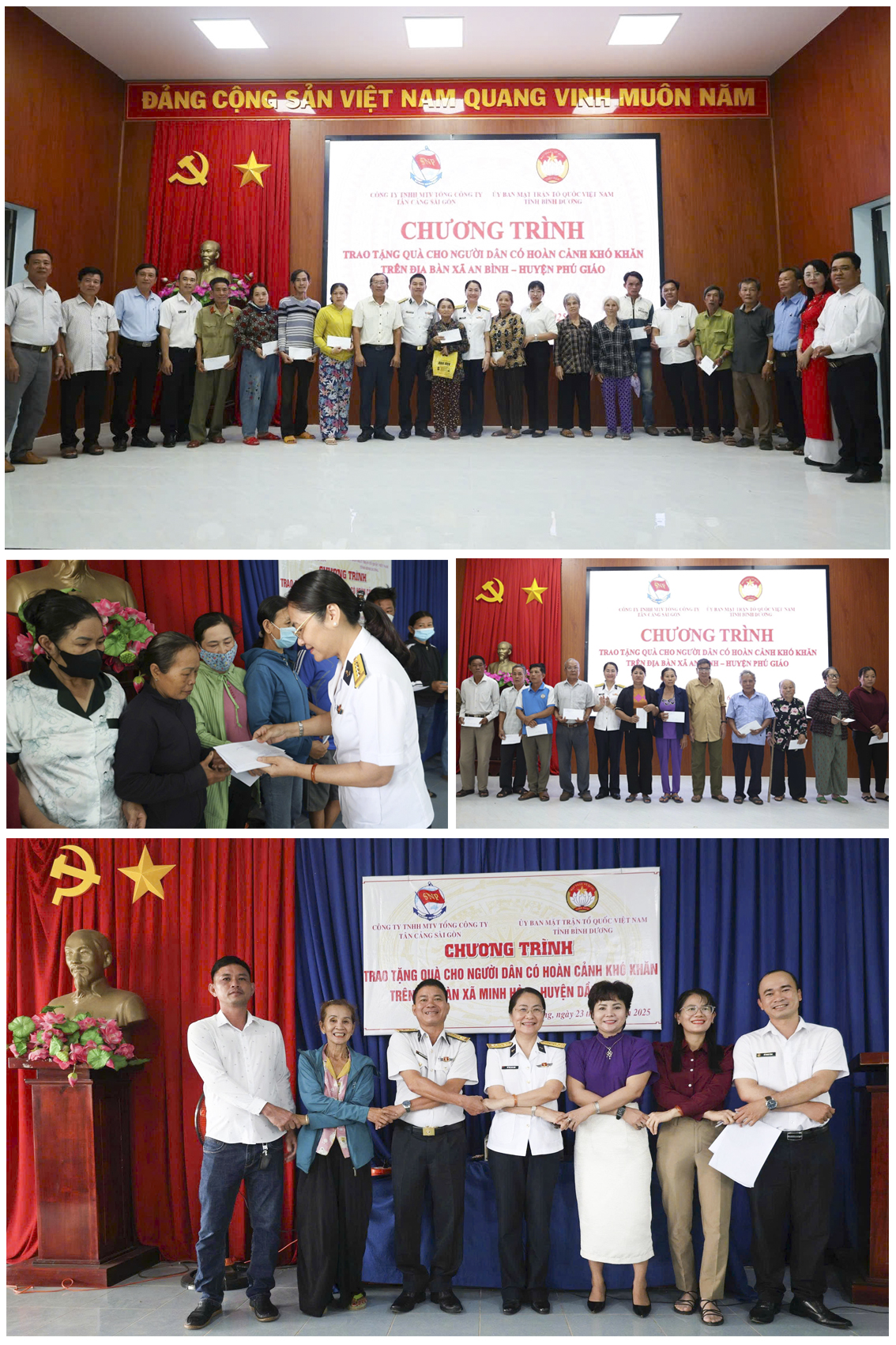 Sáng 26/6, tại tỉnh Bình Dương, Công ty Cổ phần ICD Tân cảng Sóng Thần (ICDST), đại diện Binh đoàn 20-Tổng công ty Tân cảng Sài Gòn (TCSG) đã phối hợp cùng Ban vận động Quỹ "Vì người nghèo" tỉnh Bình Dương và chính quyền địa phương, tổ chức chương trình trao tặng quà cho các hộ nghèo, cận nghèo, đồng bào dân tộc thiểu số có hoàn cảnh đặc biệt khó khăn tại xã Minh Hòa (huyện Dầu Tiếng) và xã An Bình (huyện Phú Giáo), tỉnh Bình Dương.