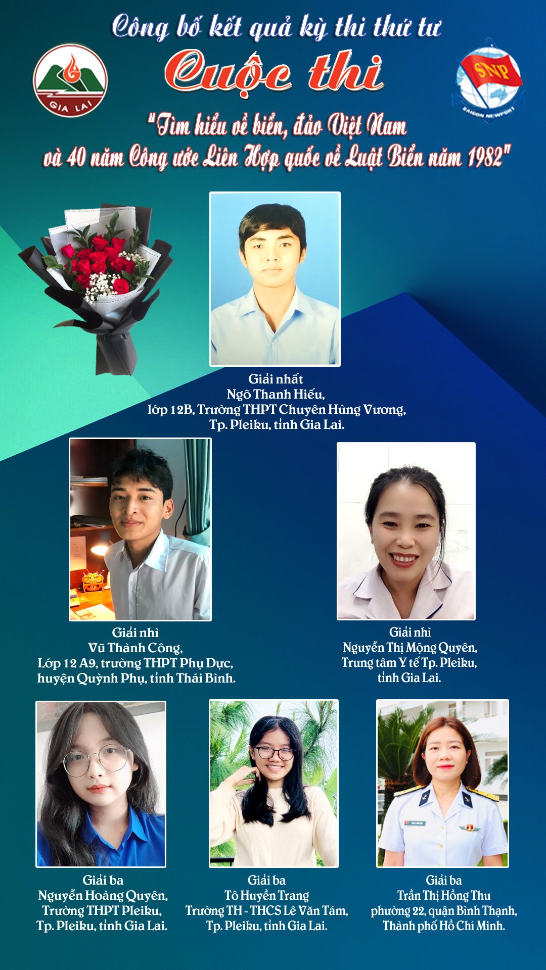 Giải Ba: Nguyễn Hoàng Quyên, học sinh lớp 10A3, Trường THPT Pleiku, Gia Lai; Trần Thị Hồng Thu, Phường 22, quận Bình Thạnh, TP. Hồ Chí Minh và Tô Huyền Trang, Trường TH-THCS Lê Văn Tám, xã Trà Đa, thành phố Pleiku, Gia Lai.