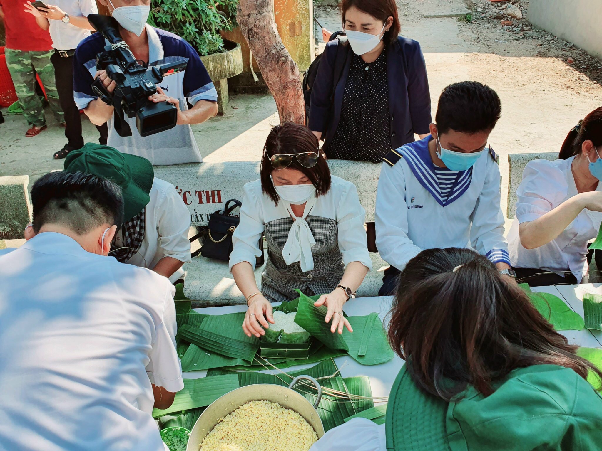 Đoàn công tác gói bánh chưng cùng bộ đội