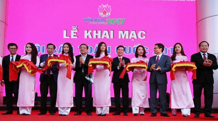 Các đại biểu cắt băng khai mạc Hội Báo toàn quốc 2017