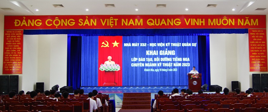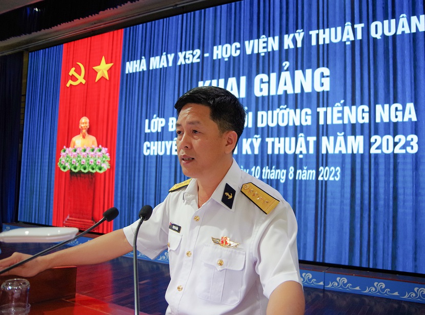 Chiều 10/8, tại TP. Cam Ranh, tỉnh Khánh Hòa, Nhà máy X52, Cục Kỹ thuật Hải quân phối hợp với Học viện Kỹ thuật Quân sự tổ chức khai giảng lớp đào tạo tiếng Nga chuyên ngành kỹ thuật năm 2023. Đại tá Phạm Bá Bằng, Chính ủy Nhà máy chủ trì.