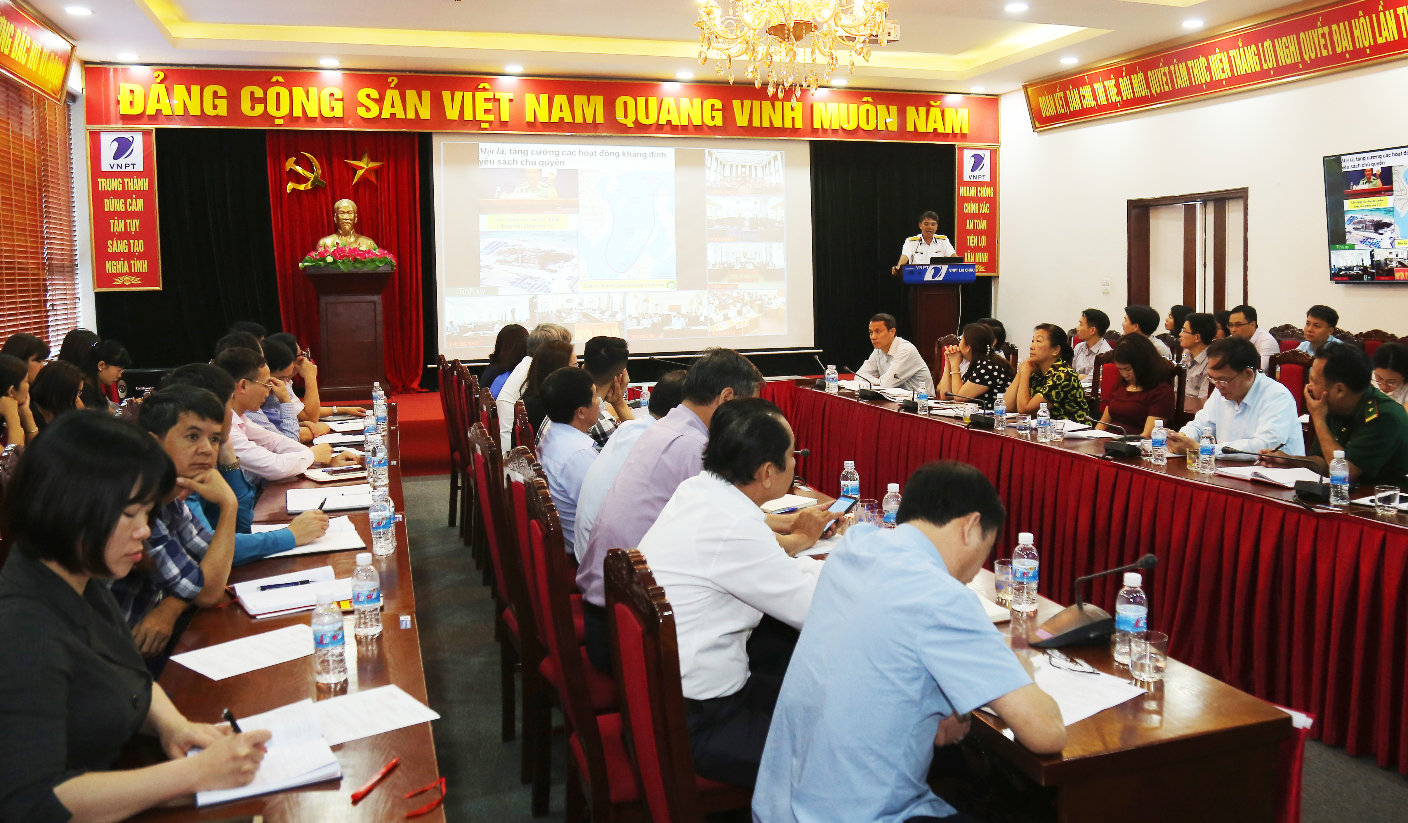 Cũng trong sáng 23-4, tại trung tâm hội nghị Viễn thông tỉnh Lai Châu, Báo cáo viên của Cục Chính trị Hải quân đã nói chuyện chuyên đề về biển, đảo với lãnh đạo địa phương, báo cáo viên các cấp; các tổ chức chính trị, đoàn thể tỉnh Lai Châu. Buổi nói chuyện được kết nối trực tuyến đến 72 điểm cầu trong toàn tỉnh, trong đó có 10 điểm cầu tại các huyện, thành phố Lai Châu, Đảng uỷ khối Doanh nghiệp tỉnh và 62 điểm cầu tại các xã trên địa bàn tỉnh.