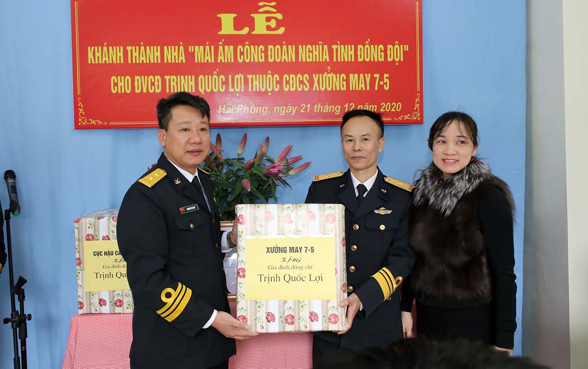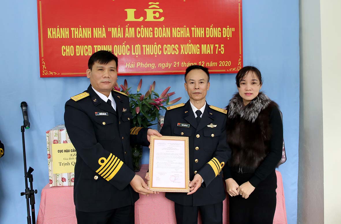 Sáng 21-12, tại phường Anh Dũng, quận Dương Kinh, TP. Hải Phòng, Cục Chính trị Hải quân phối hợp với Cục Hậu cần Hải quân và chính quyền địa phương tổ chức khánh thành, bàn giao nhà “Mái ấm công đoàn-Nghĩa tình đồng đội” cho gia đình Thiếu tá QNCN Trịnh Quốc Lợi, đoàn viên Công đoàn cơ sở Xưởng may 7-5, Cục Hậu cần.