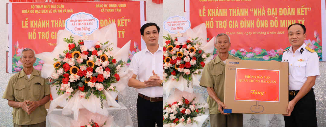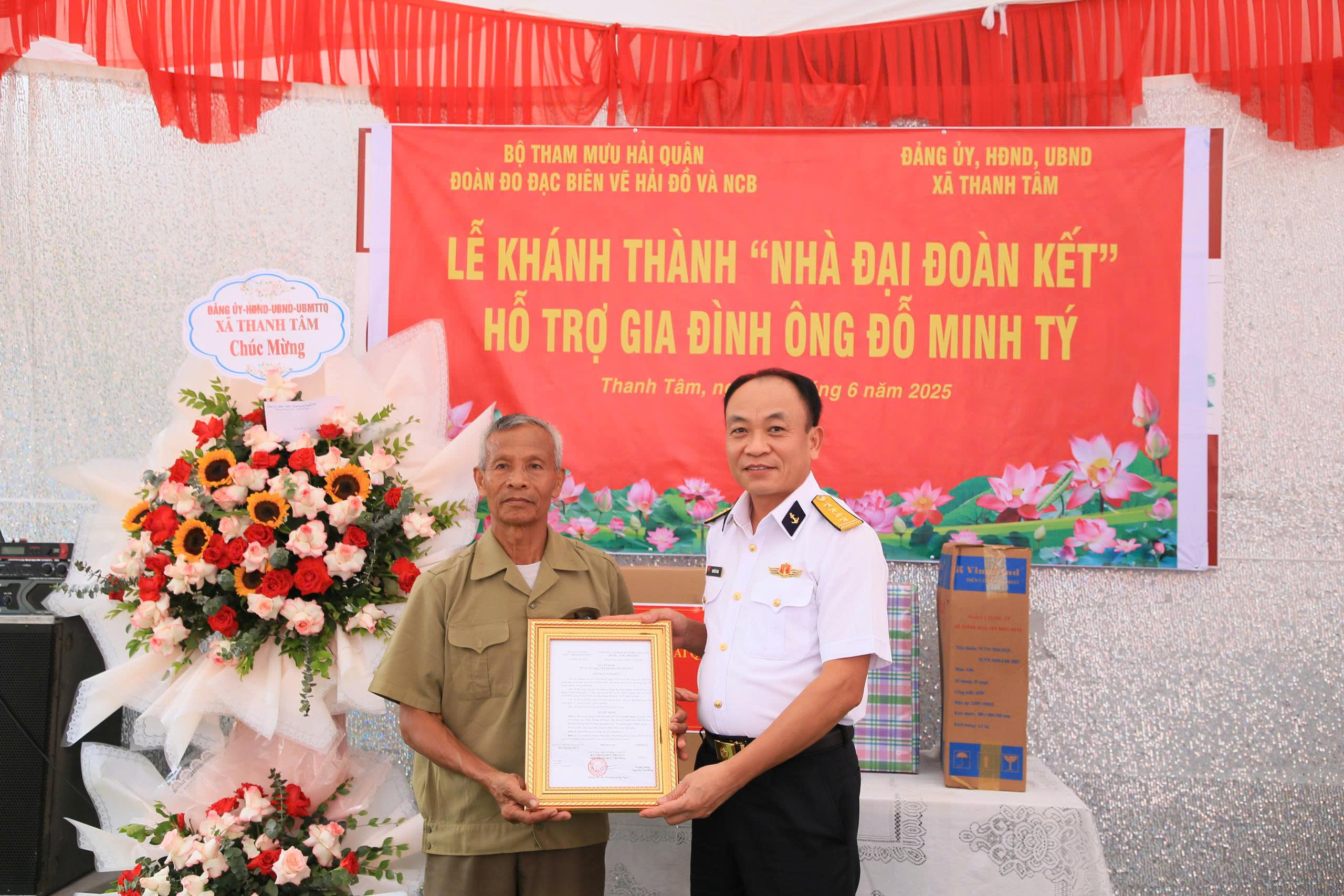 Sáng 3/6, tại xã Thanh Tâm, huyện Thanh Liêm, tỉnh Hà Nam, Đoàn Đo đạc biên vẽ hải đồ và nghiên cứu biển (Bộ Tham mưu Hải quân) phối hợp với cấp ủy, chính quyền địa phương, tổ chức Lễ khánh thành và bàn giao nhà đại đoàn kết cho ông Đỗ Minh Tý.