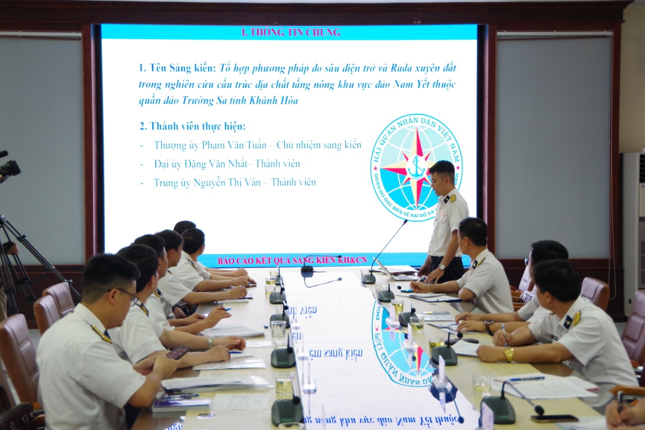 Đoàn công tác đã nghe đại diện các nhóm tác giả đạt giải TTST lần thứ 23 và các nhóm tác giả đề tài, sáng kiến được đề nghị trao giải lần thứ 24 báo cáo kết quả ứng dụng vào hoạt động thực tiễn tại đơn vị (2 đề tài đạt giải Ba TTST lần thứ 23 và 4 đề tài được đề nghị xét trao giải TTST lần thứ 24 của Đoàn Đo đạc biên vẽ hải đồ và nghiên cứu biển và Viện Kỹ thuật Hải quân).