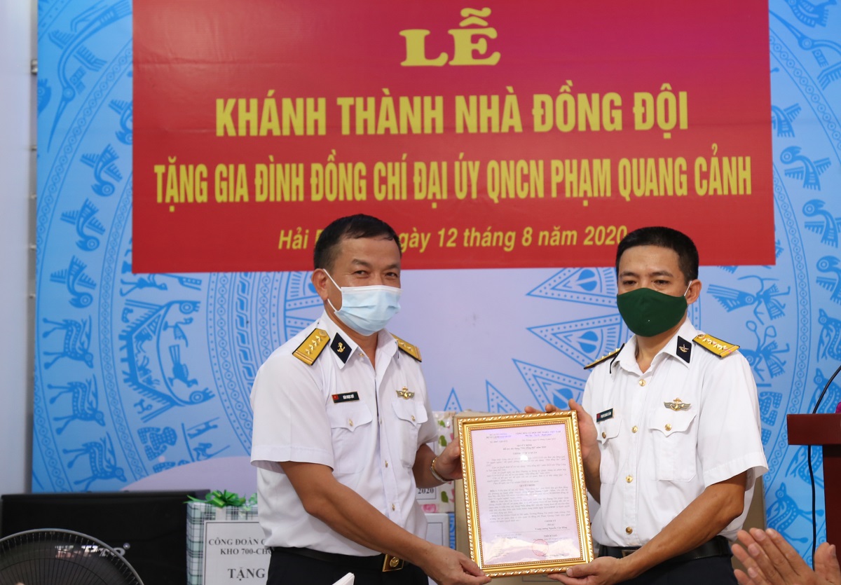 Sáng 12-8, tại tổ 5, phường Lãm Hà, quận Kiến An, TP. Hải Phòng, Kho 700, Cục Hậu cần Hải quân tổ chức khánh thành và bàn giao nhà đồng đội tặng gia đình Đại úy QNCN Phạm Quang Cảnh, Nhân viên nấu ăn thuộc Ban Hậu cần, Kho 700. Đại tá Đào Ngọc Quỳ, Bí thư Đảng ủy, Chính ủy Cục Hậu cần dự lễ khánh thành và trao quyết định tặng nhà.