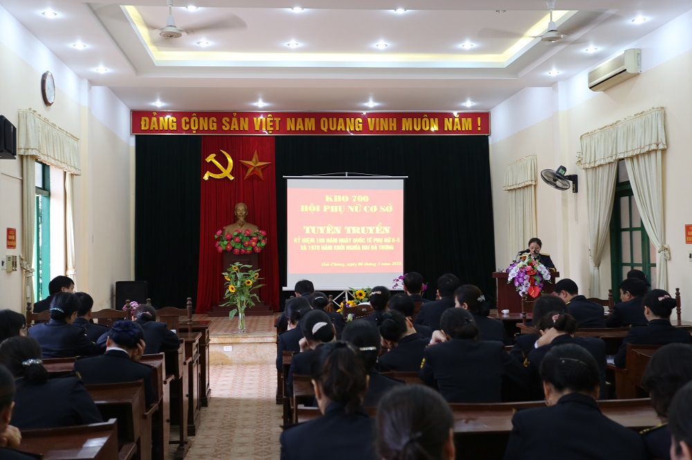 Sáng 6-3, Hội Phụ nữ cơ sở Kho 700, Cục Hậu cần Hải quân đã tổ chức nói chuyện truyền thống nhân dịp kỷ niệm 108 năm Ngày Quốc tế Phụ nữ (8-3) và 1978 năm khởi nghĩa Hai Bà Trưng. Hơn 70 cán bộ, hội viên đã tham dự.