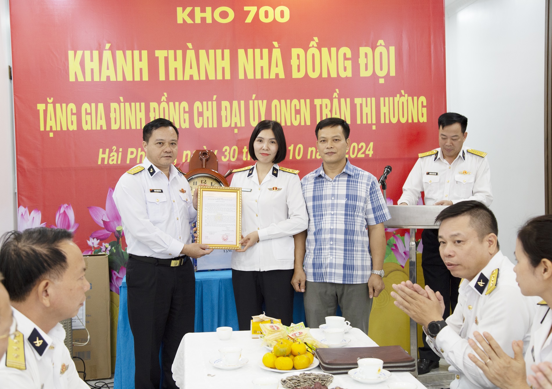 Sáng 30/10, tại tổ dân phố Bình Kiều 1, phường Đông Hải 2, thành phố Hải Phòng, Kho 700, Cục Hậu cần Hải quân tổ chức khánh thành, bàn giao nhà đồng đội tặng gia đình Đại úy QNCN Trần Thị Hường, Nhân viên Phân kho vật tư thuộc Kho 700.