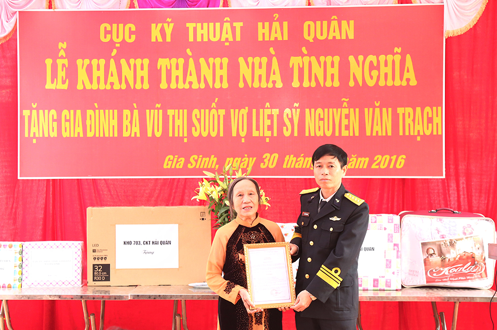 Ngày 30-11, tại Ninh Bình, Kho 703, Cục Kỹ thuật Hải quân phối hợp với chính quyền và các đoàn thể địa phương xã Gia Sinh, huyện Gia Viễn, tỉnh Ninh Bình tổ chức Lễ khánh thành và bàn giao Nhà tình nghĩa cho bà Vũ Thị Suốt vợ liệt sĩ Nguyễn Văn Trạch.