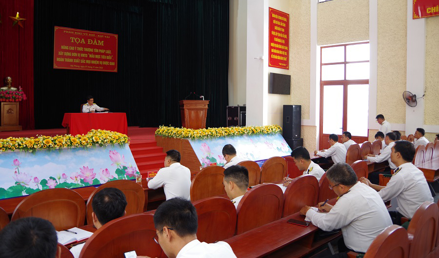 Chiều 7/11, tại Hải Phòng, Kho 703, Vùng 1 Hải quân tổ chức toạ đàm với chủ đề “Nâng cao ý thức thượng tôn pháp luật, xây dựng đơn vị VMTD mẫu mực tiêu biểu, hoàn thành xuất sắc mọi nhiệm vụ được giao”. Thượng tá Đỗ Kim Tùng, Bí thư Đảng ủy, Chính trị viên Kho dự và chỉ đạo.