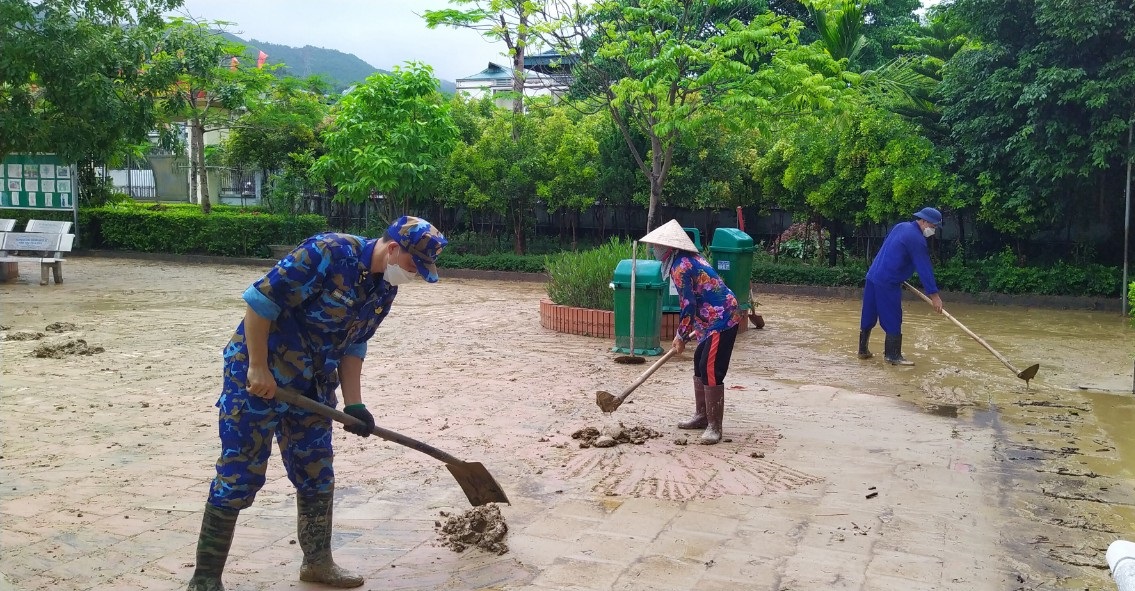 Cán bộ, chiến sĩ Kho 706 đã phối hợp với giáo viên của nhà trường tiến hành vệ sinh, dọn bùn, đất, rác thải tràn trên sân trường, thông cống thoát nước… bảo đảm an toàn cho học sinh và giáo viên học tập, sinh hoạt.