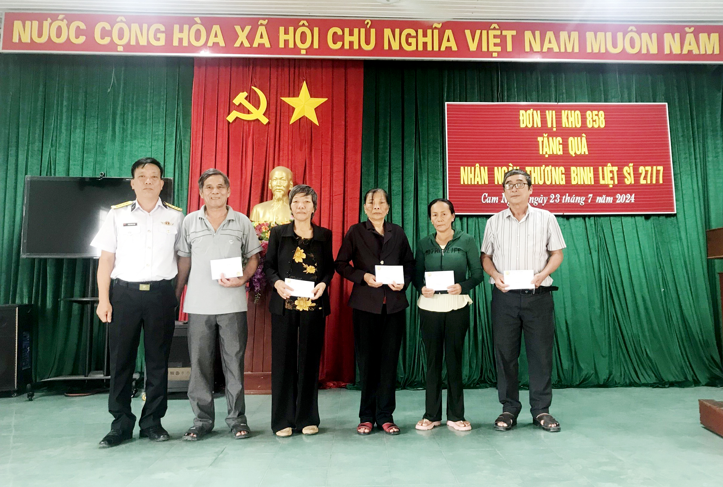 Ngày 23/7, tại TP. Cam Ranh, tỉnh Khánh Hoà, Kho 858, Cục Kỹ thuật Hải quân đã tổ chức thăm, tặng quà 15 gia đình chính sách, người có công trên địa bàn xã Cam Thịnh Tây, phường Cam Nghĩa và phường Cam Thành Bắc nhân dịp kỷ niệm 77 năm Ngày Thương binh - Liệt sĩ.