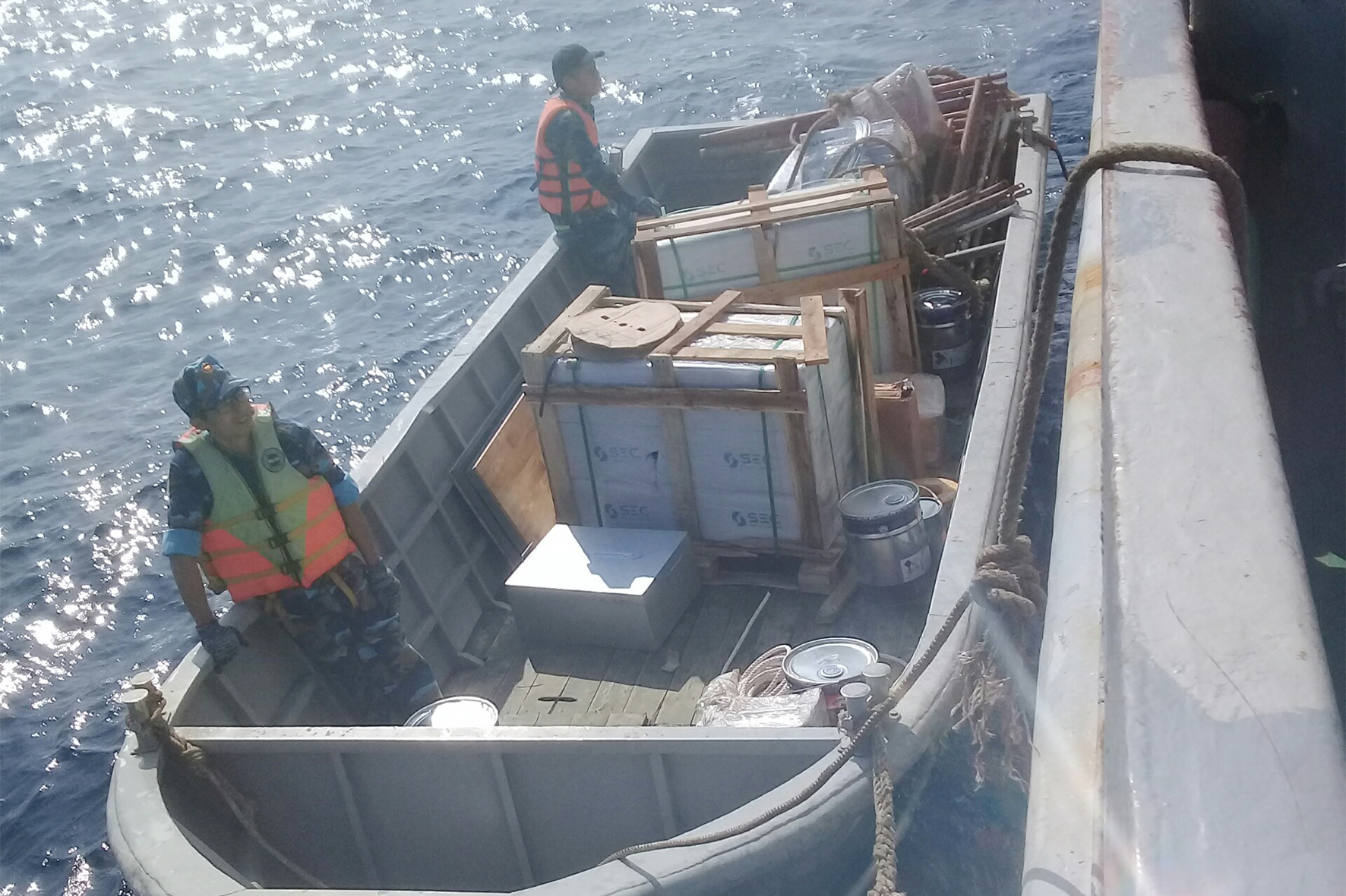 Vận chuyển thiết bị vào đảo. Ảnh: CTV