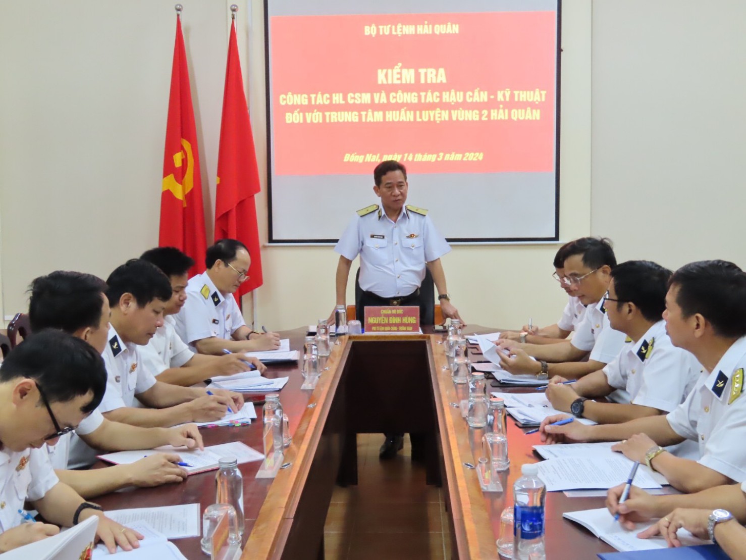 Sáng 14/3, tại huyện Nhơn Trạch, tỉnh Đồng Nai, đoàn công tác của Bộ Tư lệnh Hải quân do Chuẩn Đô đốc Nguyễn Đình Hùng, Phó Tư lệnh Quân chủng đã đến kiểm tra công tác huấn luyện chiến sĩ mới (CSM) và công tác bảo đảm hậu cần - kỹ thuật cho huấn luyện CSM tại Trung tâm Huấn luyện, Vùng 2.