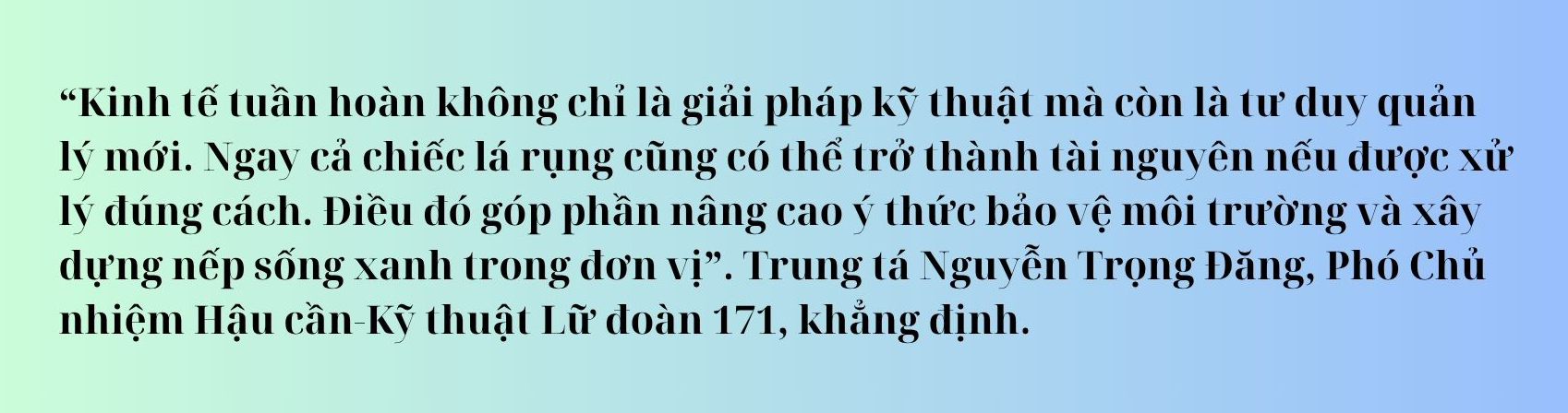 Dù mới triển khai thử nghiệm trong thời gian ngắn, nhưng mô hình kinh tế tuần hoàn tại Lữ đoàn 171 bước đầu phát huy hiệu quả. Cảnh quan đơn vị sạch, đẹp, không còn tình trạng đốt rác hữu cơ. Cán bộ, chiến sĩ hình thành thói quen phân loại rác tại nguồn và chủ động xử lý lá cây, thức ăn thừa đúng quy trình kỹ thuật. Một số khu vực trồng cây, vườn rau sử dụng phân hữu cơ tự ủ đã phát triển xanh tốt hơn.