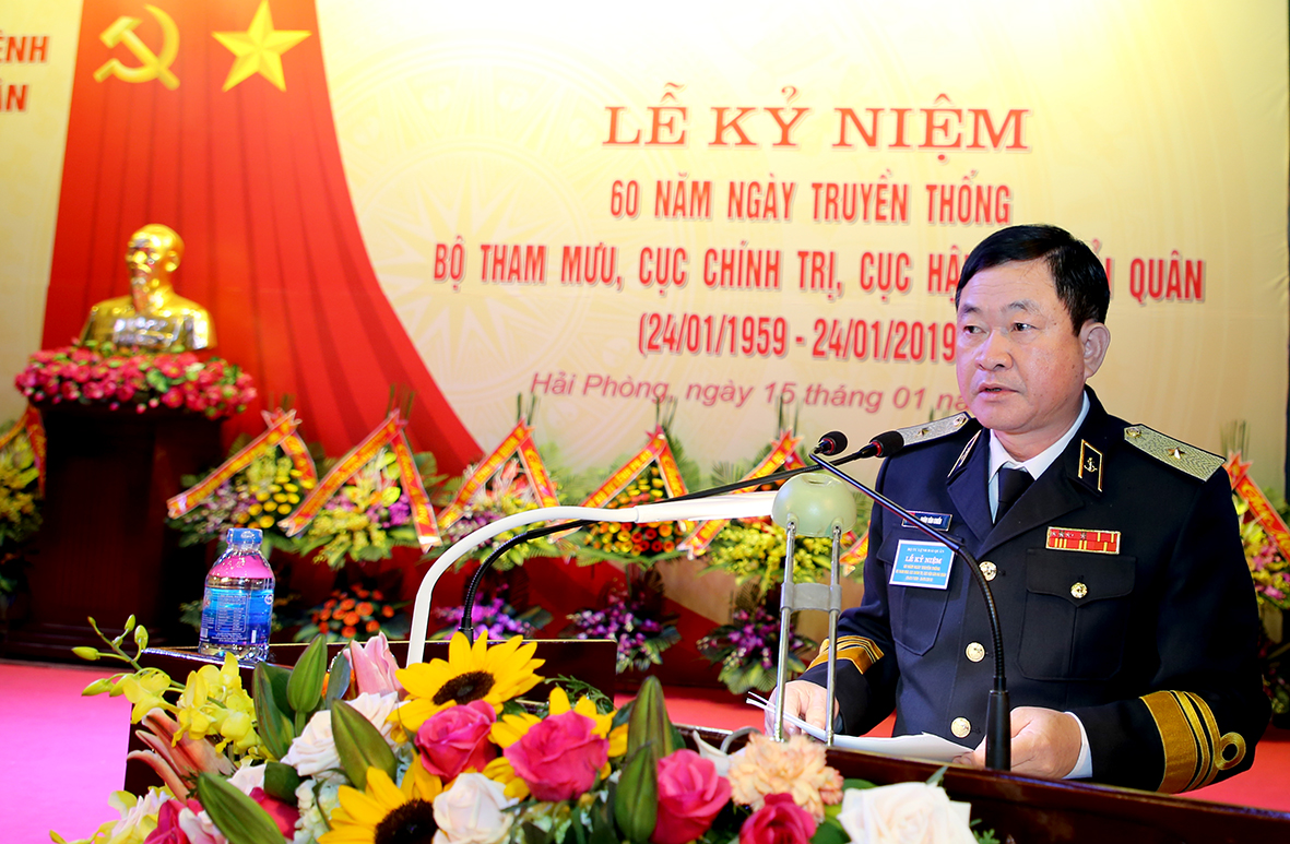 Diễn văn kỷ niệm do Chuẩn Đô đốc Đoàn Văn Chiều, Chủ nhiệm Chính trị Hải quân trình bày tại buổi lễ đã khái quát truyền thống 60 năm xây dựng, chiến đấu, phát triển và trưởng thành của 3 cơ quan. Theo đó, cách đây 60 năm, trước yêu cầu cấp thiết của nhiệm vụ quản lý, bảo vệ vùng biển đảo miền Bắc, ngày 24-1-1959, Bộ Quốc phòng ra Nghị định số 320-NĐ thành lập Cục Hải quân trên cơ sở Cục Phòng thủ bờ bể. Cơ quan Cục Hải quân có 5 phòng gồm: Phòng Tham mưu, Phòng Chính trị, Phòng Hậu cần, Phòng Công trình và Phòng Đo đạc biển; đánh dấu mốc phát triển của các cơ quan từ thực hiện nhiệm vụ nghiên cứu chuyển sang hoạt động chỉ đạo, chỉ huy các lực lượng Hải quân. Từ đó, ngày 24-1 trở thành ngày truyền thống của Bộ Tham mưu, Cục Chính trị và Cục Hậu cần Hải quân.