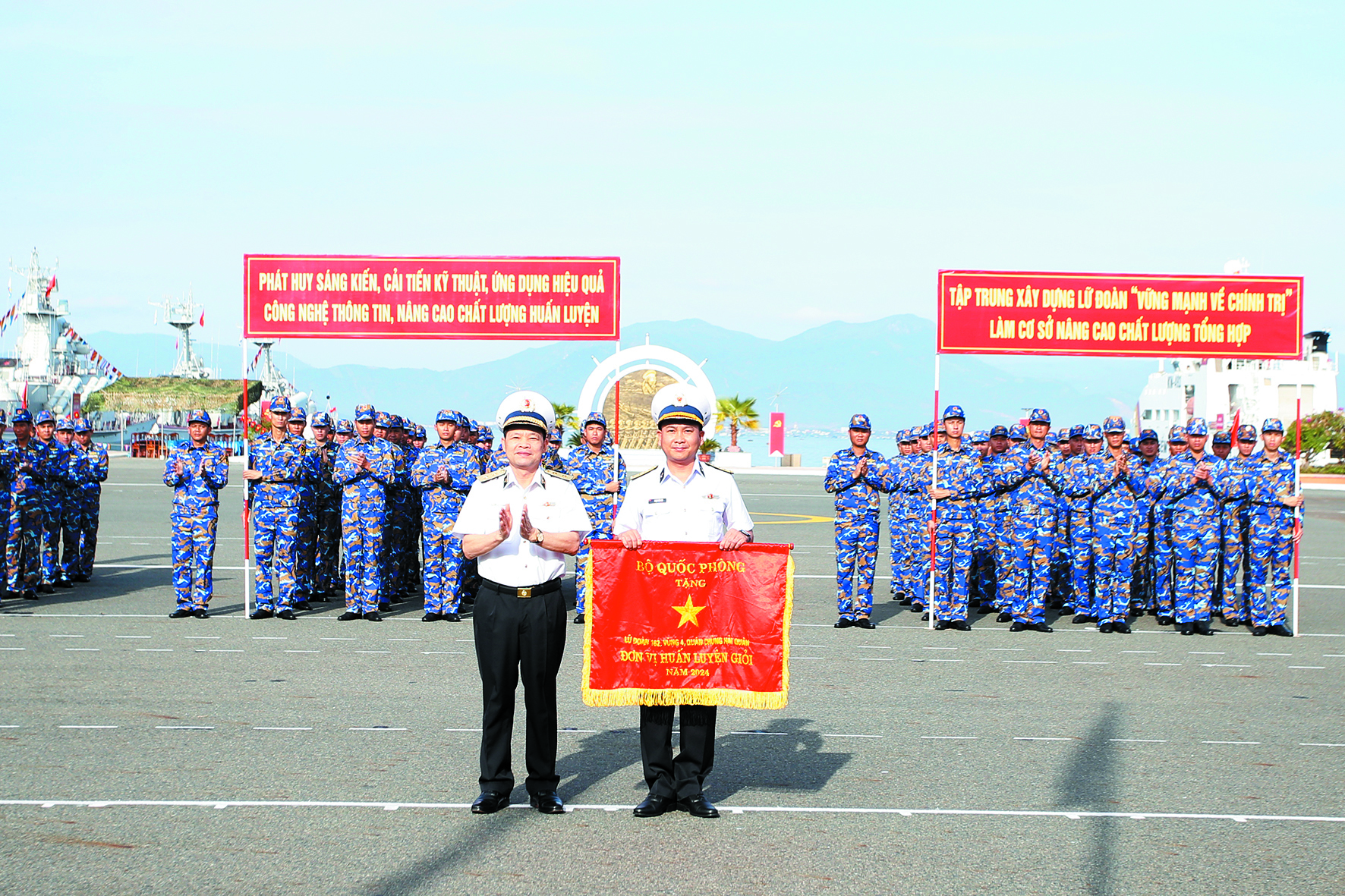 Trung tướng Nguyễn Văn Bổng, Chính ủy Hải quân trao cờ “Đơn vị huấn luyện giỏi” năm 2024 của Bộ Quốc phòng tặng Lữ đoàn 162
