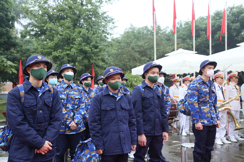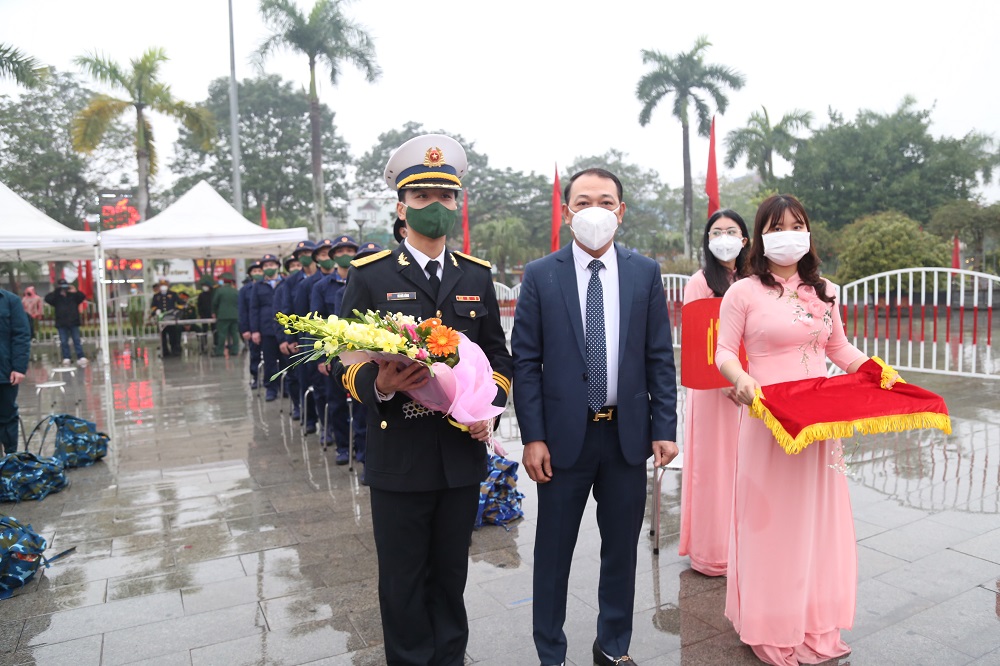 Trong không khí trang trọng của buổi lễ, Thiếu tướng Vũ Thanh Chương cùng các lãnh đạo của quận Lê Chân đã tặng hoa và động viên các thanh niên lên đường nhập ngũ.