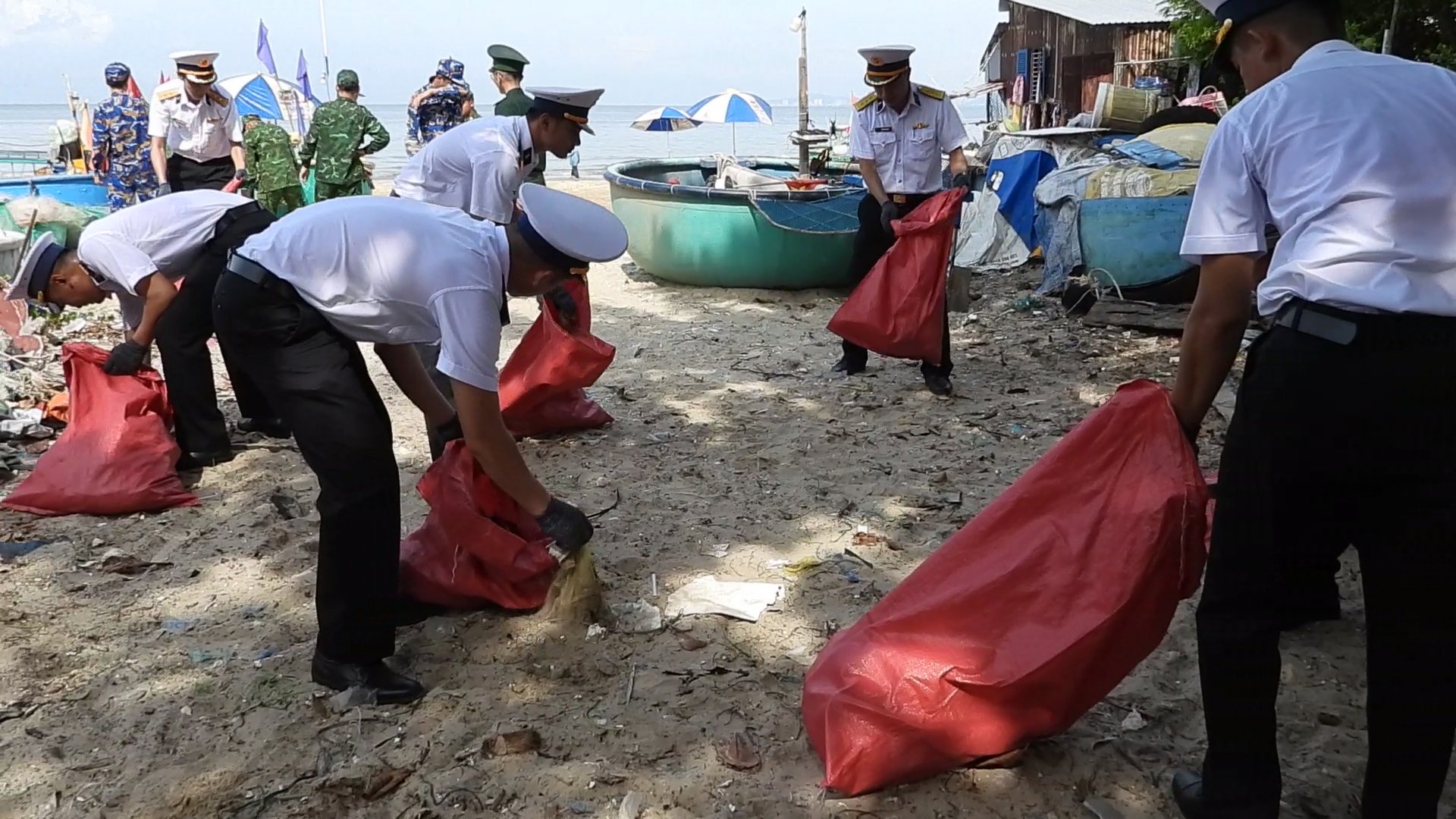 Đoàn viên, thanh niên Hải đoàn 129 tham gia thu gom rác thải tại khu vực biển thị trấn Long Hải