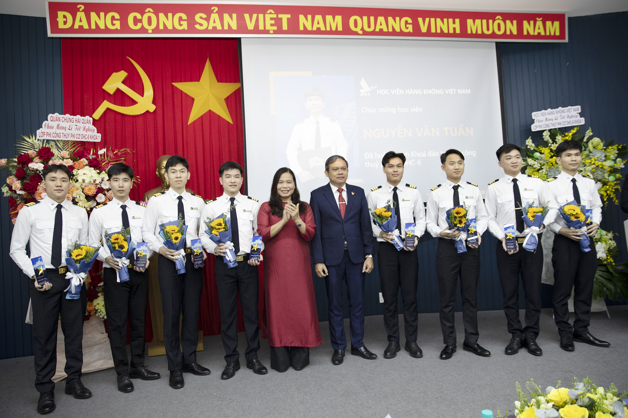 Lãnh đạo Học viện Hàng không Việt Nam trao cúp và hoa chúc mừng phi công tốt nghiệp