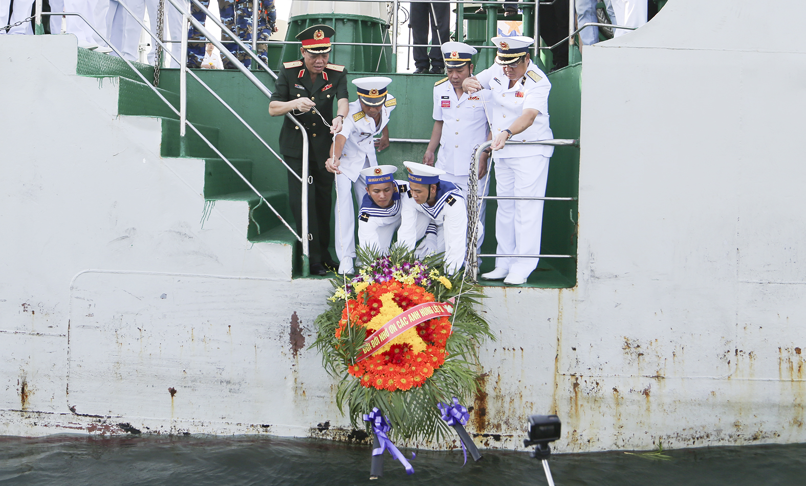Các đại biểu thả hoa tưởng niệm cán bộ, chiến sĩ hy sinh trong Chiến dịch đổ bộ đường biển Tà Lơn