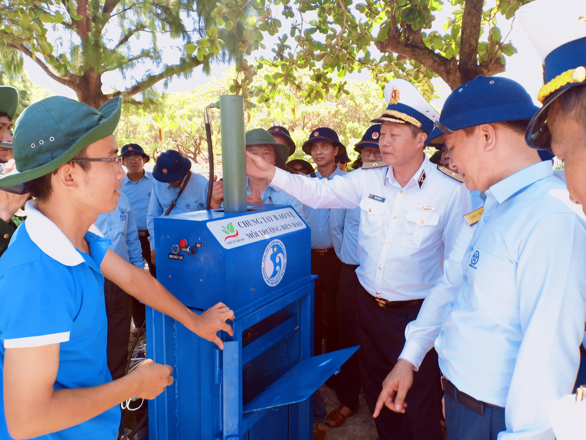 Thành viên CLB Tuổi trẻ vì biển đảo quê hương báo cáo đoàn công tác về cách sử dụng máy ép rác C-Sea trên đảo Song Tử Tây