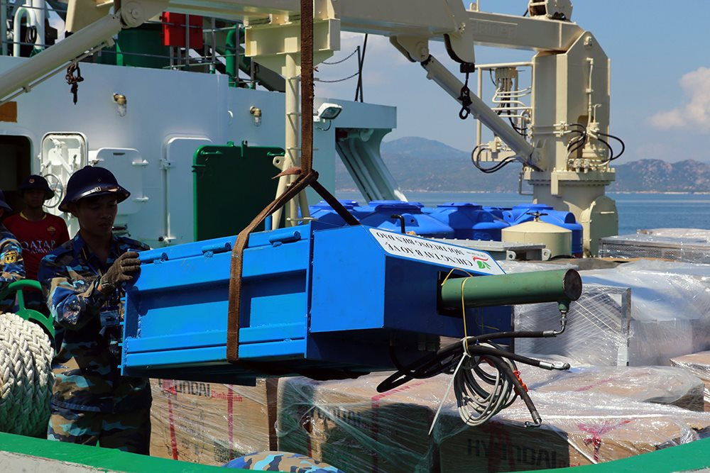 Máy ép rác C-Sea được đưa xuống tàu để vận chuyển ra đảo. Ảnh: CTV