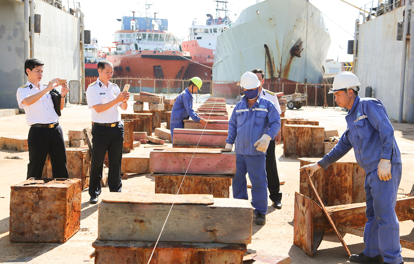 Các thông tin viên đã phỏng vấn, trao đổi trực tiếp với những công nhân đang lao động, sản xuất tại đốc nổi 9202 thuộc Xí nghiệp Sửa chữa.