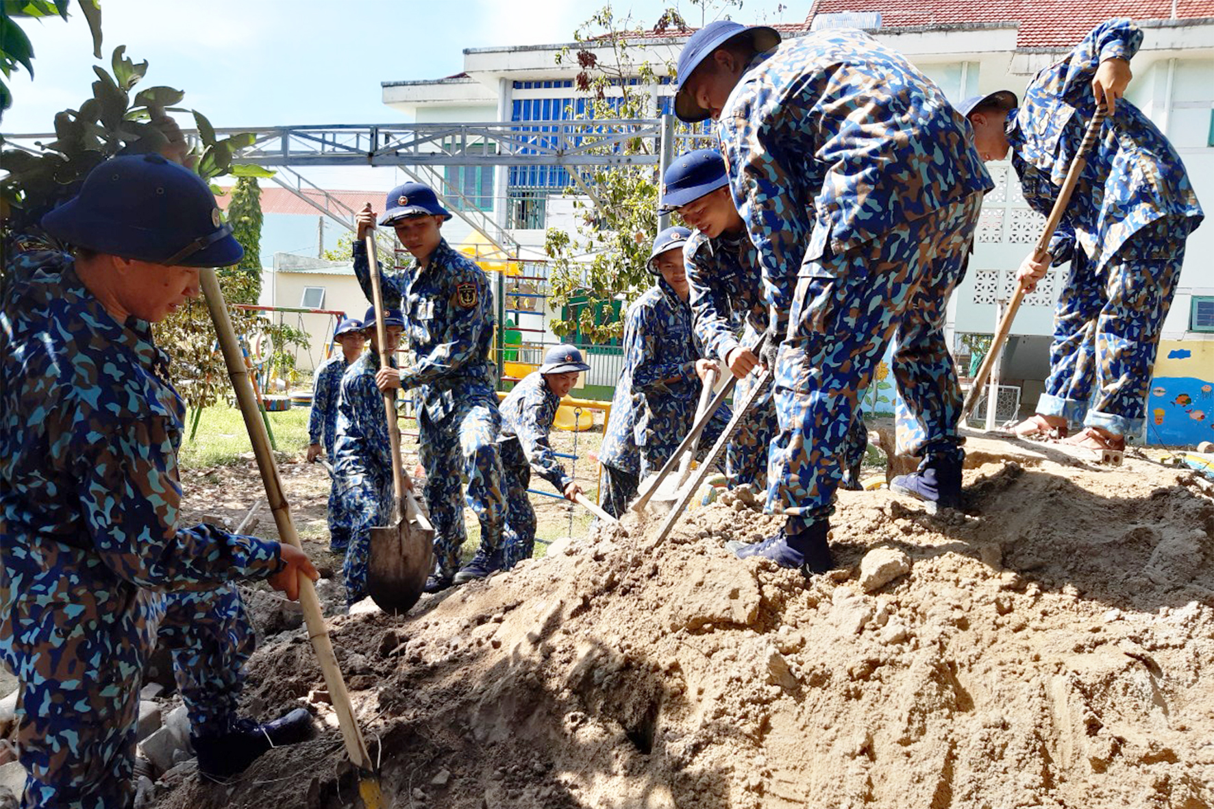 Cán bộ, chiến sĩ Lữ đoàn 101 làm đẹp khuôn viên trường học xã Cam Thành Bắc