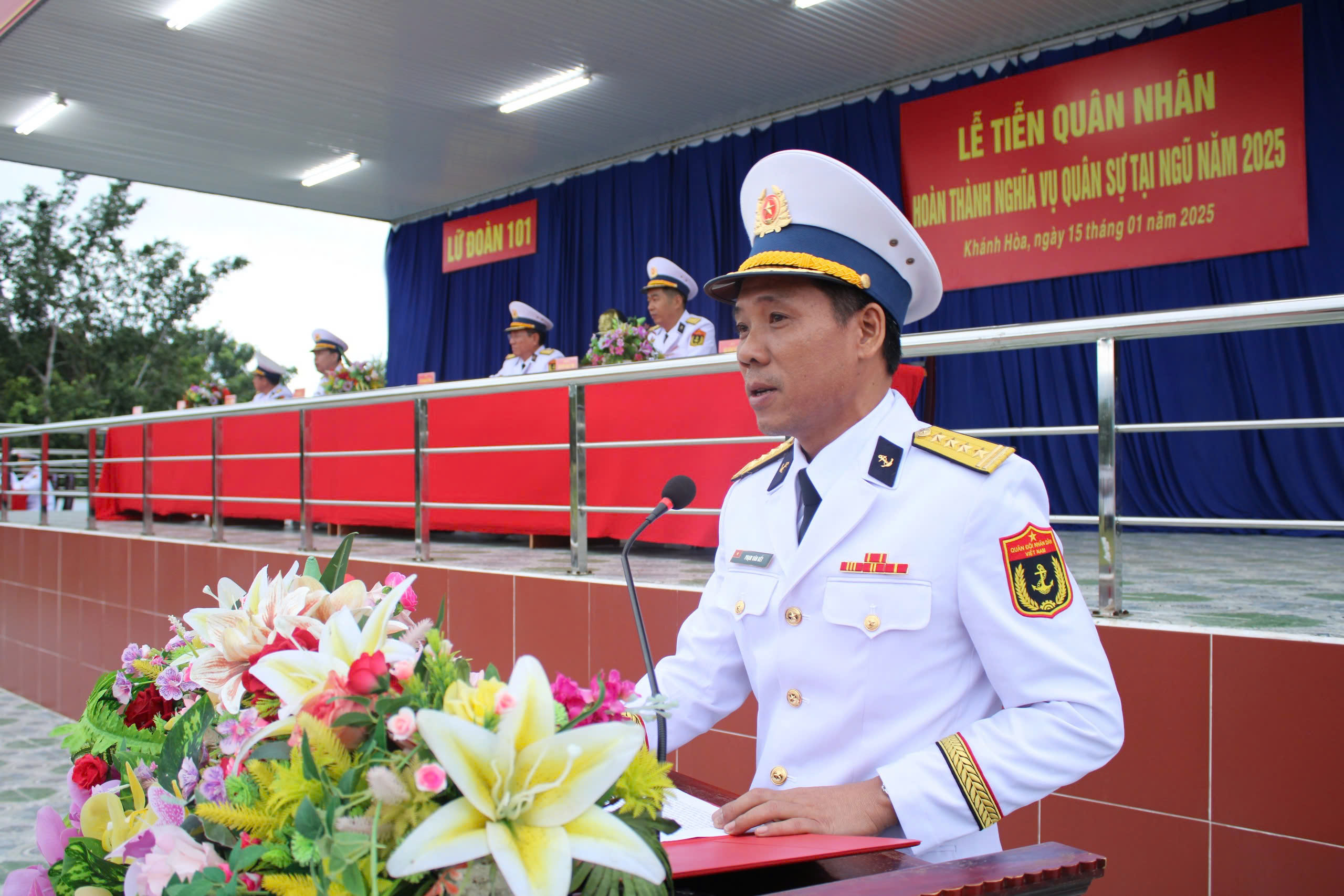 Sáng 15/1, tại xã Cam Thành Bắc, huyện Cam Lâm, tỉnh Khánh Hòa, Lữ đoàn 101, Vùng 4 Hải quân tổ chức Lễ tiễn quân nhân hoàn thành nghĩa vụ quân sự năm 2025. Dự lễ có Đại tá Phạm Văn Kết, Phó Chủ nhiệm Chính trị Vùng 4; Đại tá Bùi Quang Thuyên Lữ đoàn trưởng; Đại tá Phạm Duy Hướng, Chính ủy Lữ đoàn.