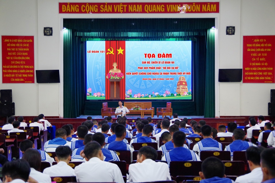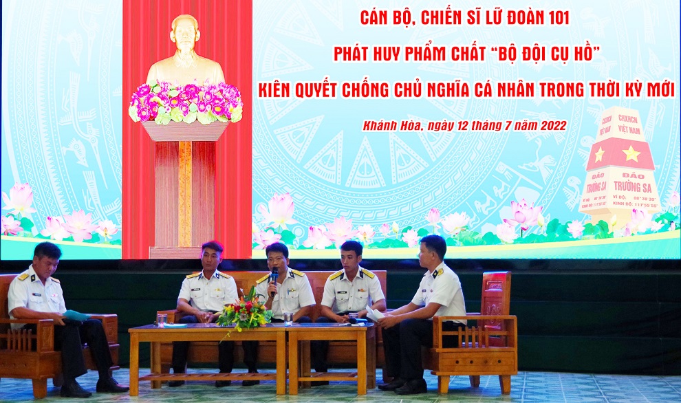 Tối 12/7, tại huyện Cam Lâm, tỉnh Khánh Hòa, Lữ đoàn 101, Vùng 4 Hải quân tổ chức tọa đàm chủ đề: "Cán bộ, chiến sĩ Lữ đoàn 101 phát huy phẩm chất “Bộ đội Cụ Hồ”, kiên quyết chống chủ nghĩa cá nhân trong thời kỳ mới".