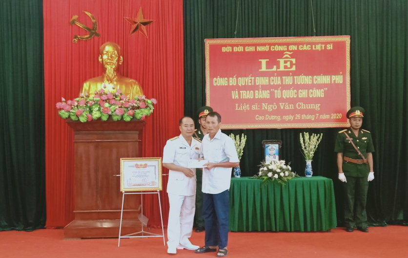 Ngày 26-7, tại xã Cao Dương, huyện Thanh Oai, TP. Hà Nội, Lữ đoàn 101, Vùng 4 Hải quân phối hợp với chính quyền địa phương, Ban chỉ huy quân sự huyện Thanh Oai tổ chức công bố quyết định, trao bằng “Tổ quốc ghi công” liệt sĩ Ngô Văn Chung.