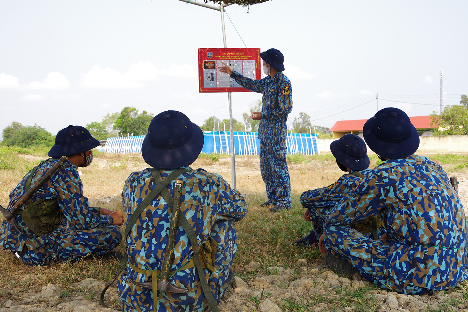 Giờ giải lao, các chiến sĩ chia thành các nhóm nhỏ, giữ khoảng cách tiếp xúc