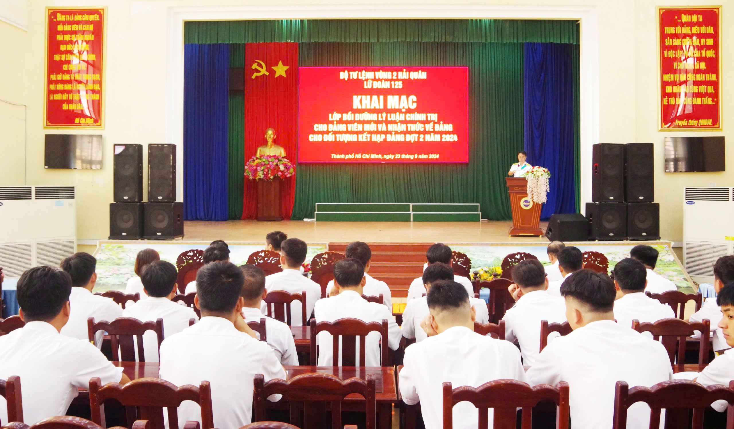 Sáng 23/9, tại TP. Hồ Chí Minh, Lữ đoàn 125, Vùng 2 Hải quân tổ chức khai mạc lớp bồi dưỡng lý luận chính trị cho đảng viên mới và đối tượng kết nạp đảng đợt 2 năm 2024. Thượng tá Lê Hồng Quang, Phó Chính ủy Lữ đoàn 125 dự, chỉ đạo.