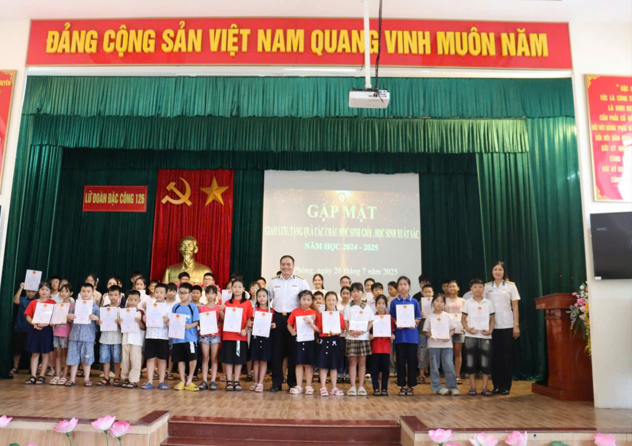 Sáng 26/7, tại phường Hoà Bình, TP. Hải Phòng, Lữ đoàn Đặc công Hải quân 126 tổ chức gặp mặt, tặng quà các cháu là học sinh giỏi, học sinh xuất sắc năm học 2024-2025 là con SQ, QNCN đang công tác tại đơn vị. Thượng tá Nguyễn Như Tuyến, Phó Chính ủy Lữ đoàn chủ trì.