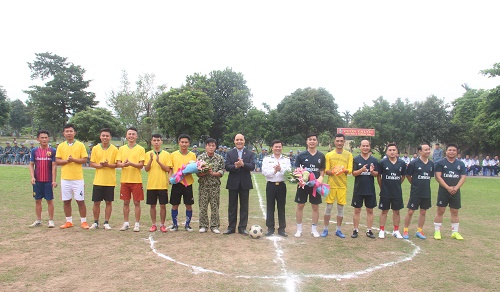 Lãnh đạo Lữ đoàn 126 và Nhà xuất bản Chính trị Quốc gia-Sự thật tặng hoa hai đội trước khi giao hữu bóng đá
