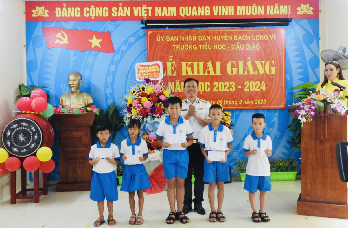 Tới dự lễ khai giảng cùng thầy cô và học sinh Trường Tiểu học-Mẫu giáo Bạch Long Vĩ, đại diện Lữ đoàn 126 đã trao 5 phần quà tặng 5 em học sinh; tặng hoa và chúc nhà trường đạt được nhiều kết quả cao, hoàn thành xuất sắc nhiệm vụ năm học 2023-2024.