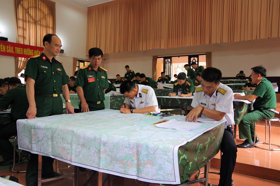 Cặp thí sinh của Lữ đoàn 126 thực hành nội dung thi soạn thảo văn kiện diễn tập
