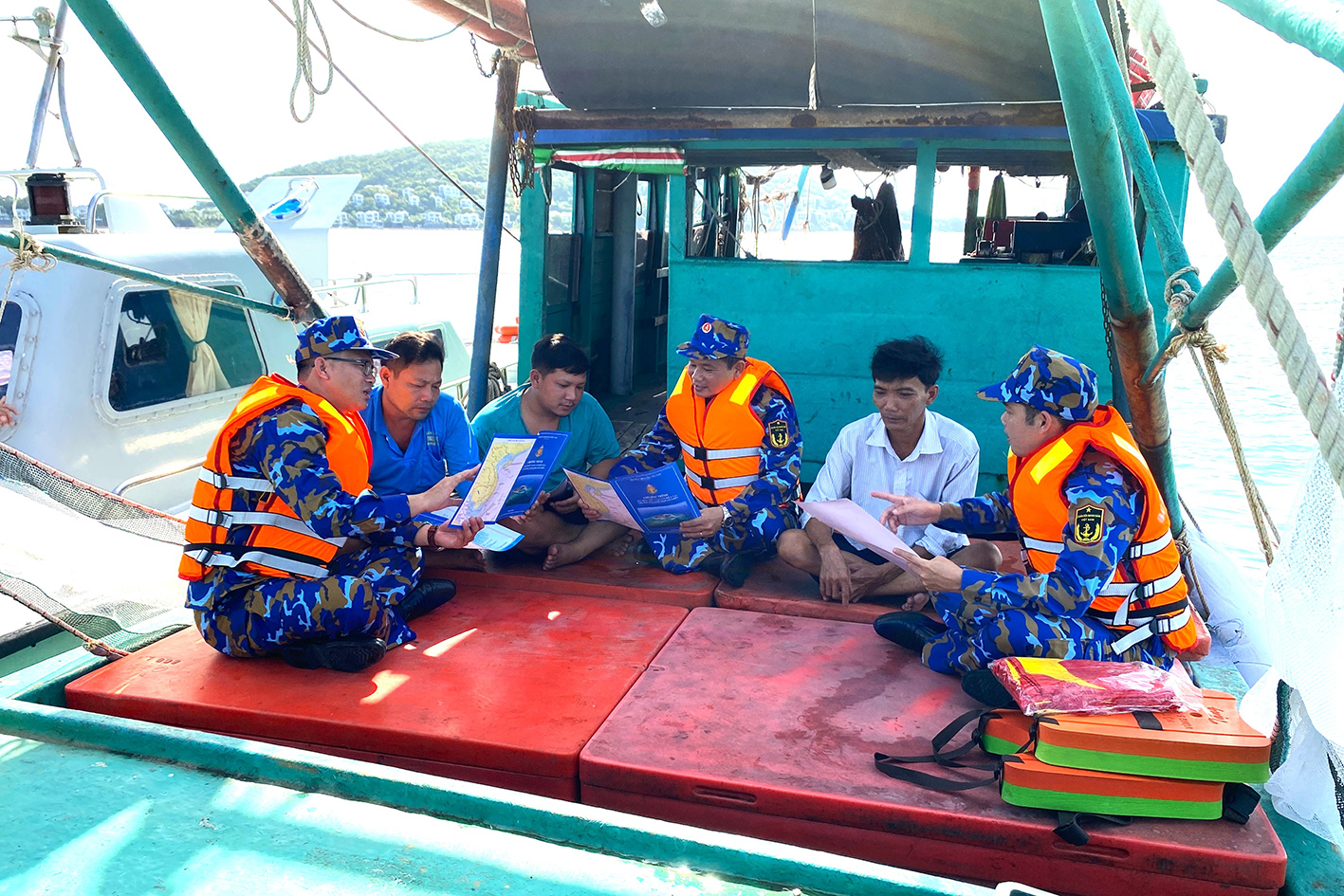 Đoàn công tác của Lữ đoàn 127 tuyên truyền, phổ biến kiến thức pháp luật cho ngư dân trên vùng biển Tây Nam. Ảnh: VĐ