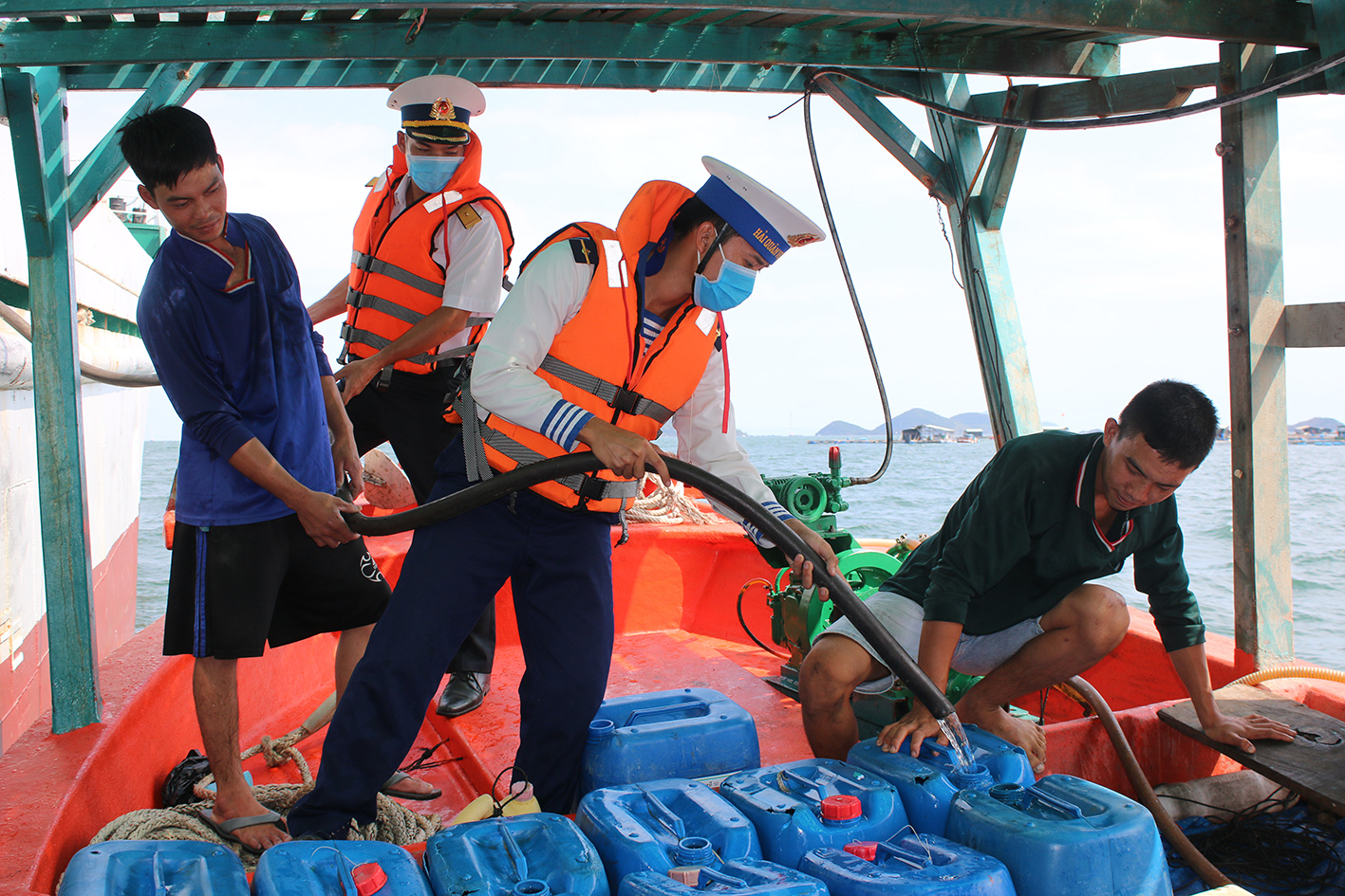 Cán bộ, chiến sĩ Tàu 637, Hải đội 511, Lữ đoàn 127 cấp nước ngọt miễn phí cho các tàu cá của ngư dân. Ảnh: VĐ