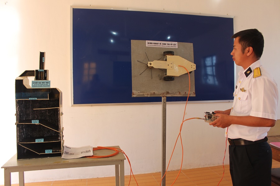 Đại úy Nguyễn Văn Duân, Trưởng ban Tàu thuyền Phòng Kỹ thuật thuyết trình sản phẩm rô bốt vệ sinh tàu vỏ sắt tại hội thi