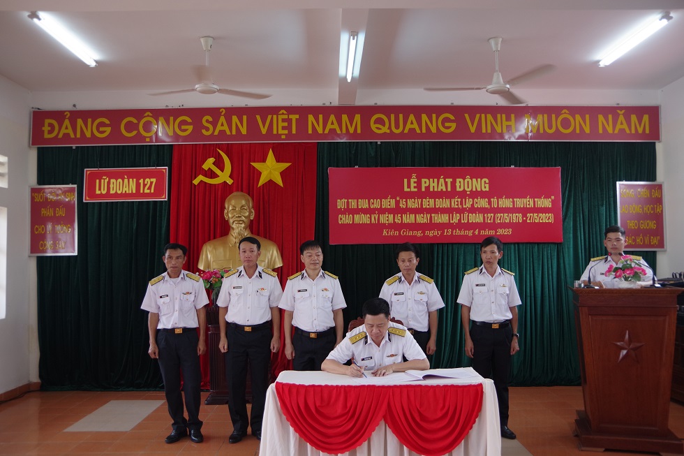 Chiều 13/4, tại TP. Phú Quốc, tỉnh Kiên Giang, Lữ đoàn 127, Vùng 5 Hải quân tổ chức phát động đợt thi đua cao điểm với chủ đề “45 ngày đêm đoàn kết, lập công, tô hồng truyền thống” chào mừng kỷ niệm 45 năm Ngày thành lập Lữ đoàn (27/5/1978 - 27/5/2023).