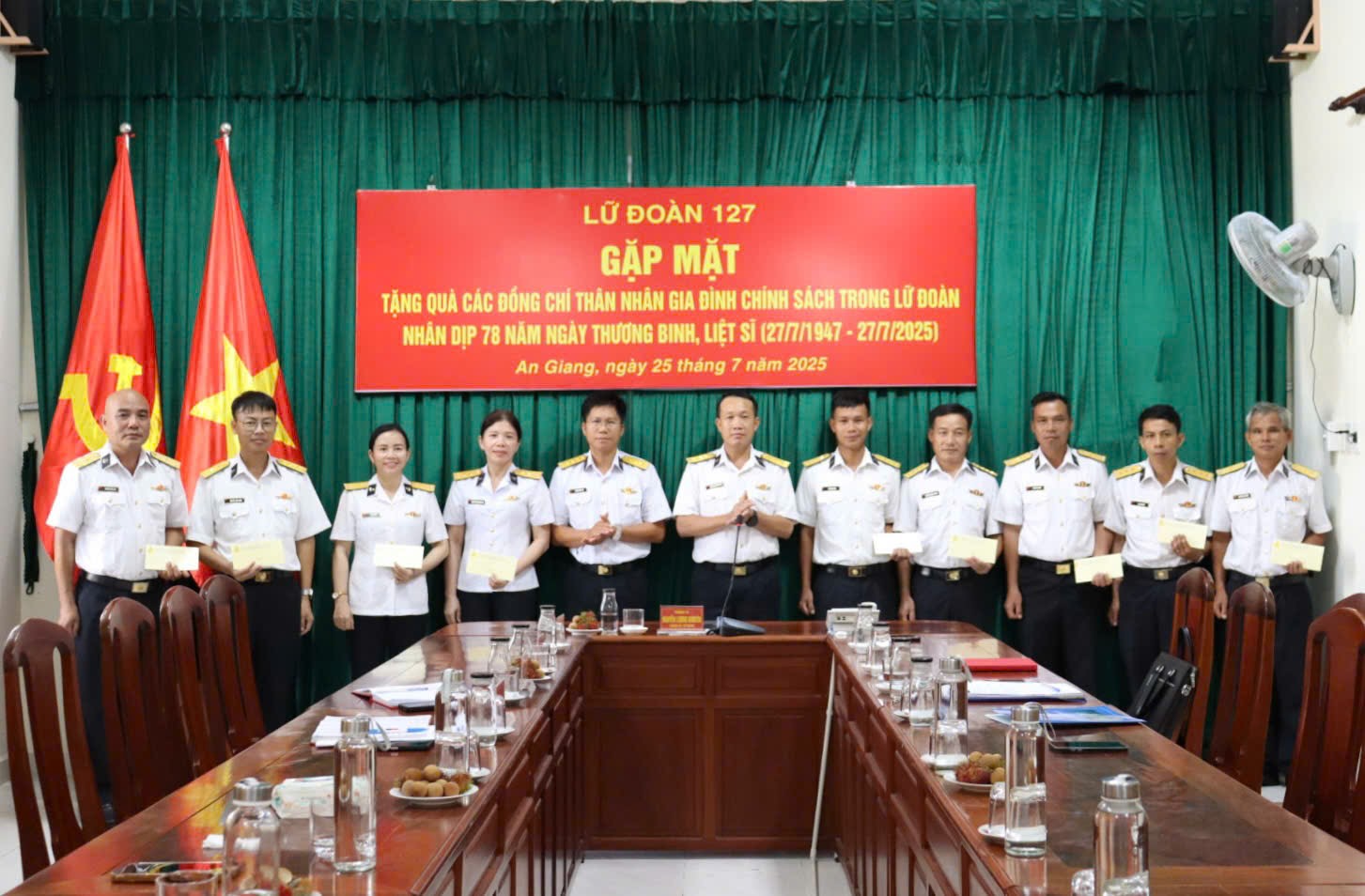Chiều 25/7, tại đặc khu Phú Quốc, tỉnh An Giang, Lữ đoàn 127, Vùng 5 Hải quân, tổ chức thăm hỏi, tặng quà gia đình chính sách, gặp mặt thân nhân thương binh, liệt sĩ trong đơn vị nhân dịp 78 năm Ngày thương binh, liệt sĩ (27/7/1947 – 27/7/2025). Thượng tá Nguyễn Lương Khuyên, Bí thư Đảng ủy, Chính ủy Lữ đoàn chủ trì các hoạt động.